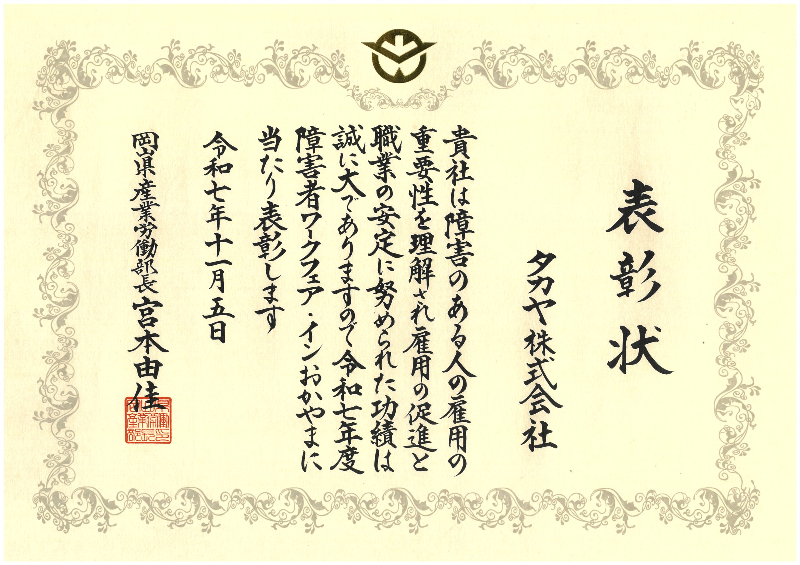 障害者雇用優良事業所として「岡山県産業労働部長表彰」を受賞いたしました。